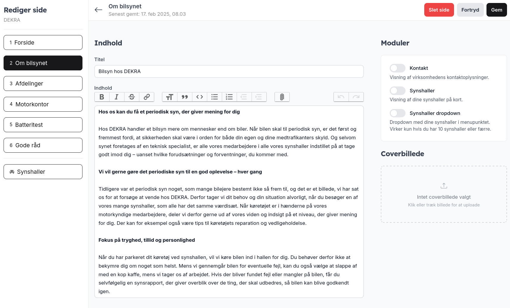 Med en stærk og veltilpasset profil gør du det nemmere for bilister at vælge netop din synshal – og giver dem de oplysninger, de har brug for, på ét sted. Skil dig ud og tiltræk flere kunder med en synshal-side, der afspejler din forretning.